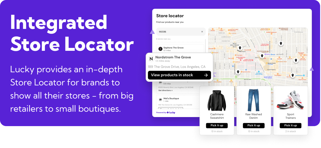 For other brands looking to implement a similar strategy, Lucky's integrated store locator tool provides an in-depth way to display all their stores–from big retailers to small boutiques. It shows customers detailed inventory amounts and product availability at each store. This empowers brands selling in third party retailers with the ability to use their own product inventory for same-day fulfillment or BOPIS with a 1-click integration.
